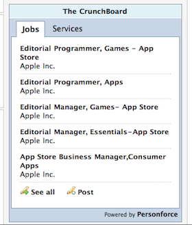 From time to time, Apple posts about new positions on our CrunchBoard job board — which we appreciate. For example, last December they posted an opening that seemed to suggest an expansion of iWork in the cloud. But today we noticed something rather interesting, Apple has posted several positions — so many that they have completely taken over the job board widget that appears on TechCrunch. And all are centered around the App Store.