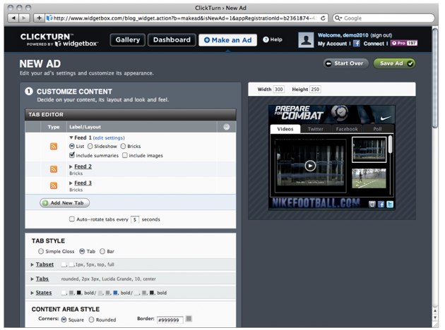 The momentum in online advertising is shifting away from traditional static text ads and towards rich media ads that are highly customized and interactive. Unfortunately, they generally take a lot more effort to create, which puts them out of reach for some companies. Enter Widgetbox‘s ClickTurn ad-builder. ClickTurn gives publishers a relatively fast and easy way to create dynamic ads with multiple tabs that include content from YouTube, Twitter and Facebook streams. Think of it as a mini site-within-a site where advertisers can showcase their best content and social media feeds.
