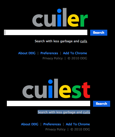 Perhaps even more interesting, DuckDuckGo is the work of one man, Gabriel Weinberg, a former co-founder of NamesDatabase (which sold to Classmates.com in 2006). As he notes on the Cuiler and Cuilest sites, “Search with less garbage and cuils.”