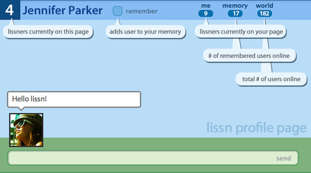 Whereas the first version was based around specific conversations, Lissn 2.0 is entirely based around individuals. It doesn’t matter what they’re talking about, only who they are, and that you might be interested in having a conversation with them, or listening in on the one they’re having. In fact, the only pages that exist on the site now beyond the list of all users online and the list of your favorite users (“memory,” as it’s called), are individual user pages. From there, you have only three options: listen in (by watching), “say something,” or “ask a question.”