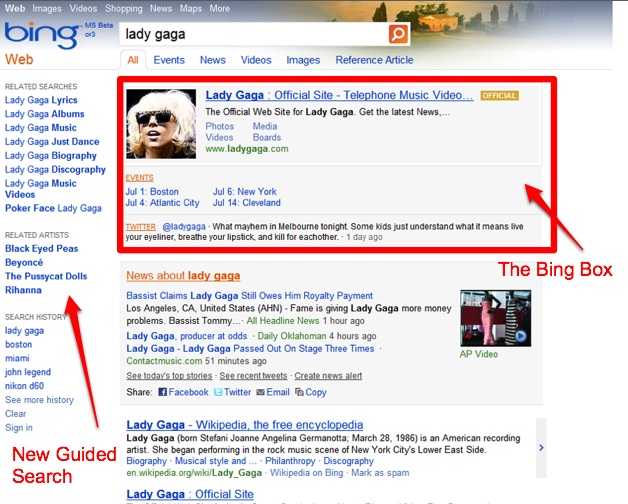 Today, Bing is announcing more refinements to its search engine. The most noticeable one is what Bing director Stefan Weitz unofficially calls the “Bing Box.” For popular search categories such as celebrities, cities, companies, musicians, movies, places, and sports, the top result will be the Bing Box, which will pull in an image and a link to the official site, along with some relevant data. For pop music star Lady Gaga, it might be concert dates and realtime Tweets. For “Miami Beach,” it might be a thumbnail of a map, the current weather, flight deals, and a list of neighborhoods.