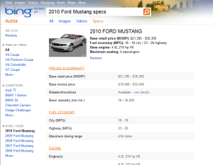 The Bing Box is similar to Google’s Universal Search Onebox that pulls in images and results from different vertical search categories and places it at the top of the search results page. But the Bing Box packages the data in a slightly different manner. “That center search pane with a bunch of links is going to change,” predicts Weitz.