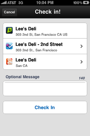 So how does it work? Well, for the time being it’s actually a mobile web app. Eventually, the plan is to release a native app version for the different platforms, but in order to get it out there relatively quickly, they made a web version that works on mobile browser that offer HTML5 support for location (currently the iPhone and Android phones). When you load it up, the browser asks for permission to pull your coordinates, and a few seconds later it pulls up a list of venues it believes you’re near. When you click on one, the app does some “magical matching” to find the venue across the various services. (If it’s unsure it asks you to confirm the venue for each different service — a bit tedious, but it goes fast as it’s just one click.) You’re then taken to the final check-in page where you can leave an optional message (which will also get sent to each of the services) and if you’re good to go, you simply hit the check-in button, and you’re done.