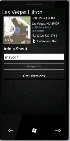 The Windows Phone 7 version also has two killer features that the iPhone version of Foursquare does not: directions within the app, and a new “Society” area. The directions element is great — it seems like daily I’m looking at a Foursquare venue on a map in the app that I’m trying to get to, but would love access to step-by-step directions. To get that on the iPhone, I have to exit the app and open the Maps app. On Windows Phone 7, it’s all integrated into the app.