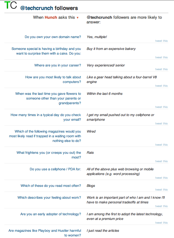 For instance, Hunch suggests that if you follow TechCrunch on Twitter—as close to 1.4 million of you do—you are more likely to be entrepreneurial, very experienced in your career, and talk about computers “like a gear head talking about a four-barrel V8 engine.”