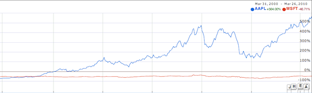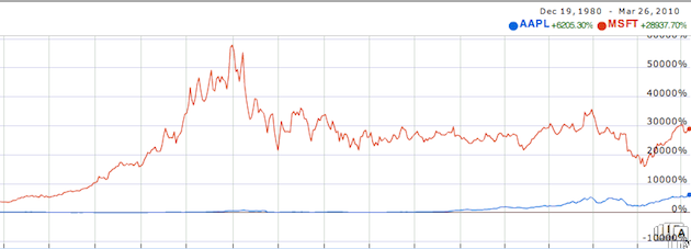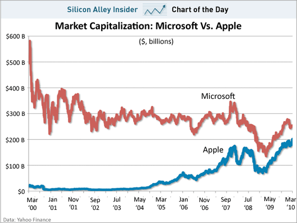 Those were, of course, different times. Aside from that 2000 spike, Microsoft’s stock and value has remained largely stagnant. For example, it 1999, its market cap was $271 billion — $10 billion more than it is today. Apple, meanwhile, didn’t make the list that year. But with a stock price around $10 at that time, it was likely worth around $5 billion. But that’s the point. Aside from a dip during the stock market collapse at the end of 2008, Apple stock has been skyrocketing. In the past 10 years, it’s up over 500%. In that same time frame, Microsoft’s stock is down nearly 50% (again from those early 2000 numbers). Apple has soared past HP, Oracle, IBM, and most recently, Google, to move into the top five most valuable companies in the U.S.
