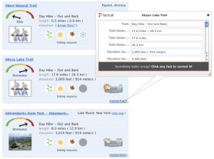 Every table now has a “visualizations” tab which lets anyone who publishes a set of data an easy way to turn that data into graphs, maps, and images. For instance, here is a map view of a restaurant database. Here is one for hiking trails which shows a difficulty dial, the length of the route, today’s weather, and which seasons the trail is open. Each visualization can be embedded as code onto a Website and is directly editable. For every entry there is an “edit this” button which lets anyone correct mistakes or add more information.