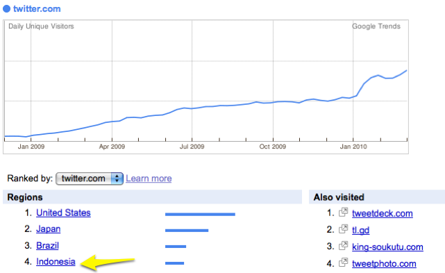 Think this event is just some anomaly? Here’s more evidence of Indonesia’s presence on Twitter: Google Trends shows that Indonesia is Twitter’s fourth largest source of traffic, behind US, Japan, Brazil.