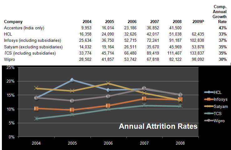 The myth is that Indian IT companies have high turnover that is and getting worse. As the graph below shows, at a time when the Indian IT industry’s growth rates averaged a dizzying 40%, attrition rates at top Indian companies fell, or stayed in the low-teen percentages. Compare this with Silicon Valley, where a typical recruit works for a new employer for three to five years at best — which translates to a 20–33% attrition rate. (Indian IT company rates dropped even further in 2009 — not reflected in the chart).