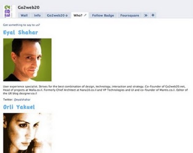If you go through all the trouble of creating your own brand page, make sure you spotlight your team’s players and say something about the people behind the curtain. It adds a personal touch to your page and builds a connection between fans and the people involved in the project. Again, with the help of the FBML tab, I’ve created a tab that tells more about my team at Go2web20 (it is was pretty easy since we’re just two people). But even if you have lots of people on your team, it is important to give some background about company management and staff accomplishments or to at least name one contact person that can be reached easily.