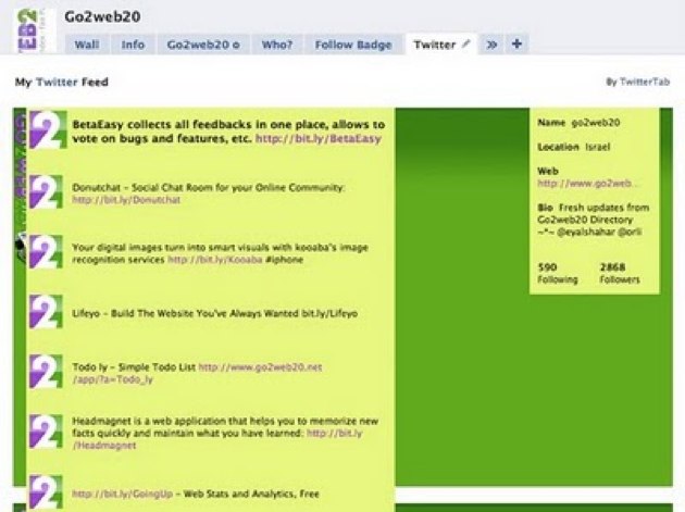Twitter Tab – This application lets you bundle your ‘Twitter Updates Tab’ into your own profile or Fan page. The process is pretty easy: just add the application and follow the instructions.