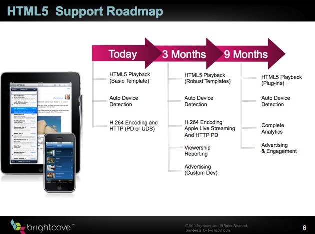 It will take until the end of the year to reach full parity with Flash, but that is his goal. At first, Brightcove videos will play back in a very basic HTML5 player when they detect an iPad. But over the next nine months or so, Brightcove will add the same audience measurement and advertising features available in its regular Flash player. Brightcove will still display the video in Flash when the viewing device supports it, but for the iPad, iPhone, and even Android phones, videos will play in HTML5 and most viewers probably won’t notice the difference.