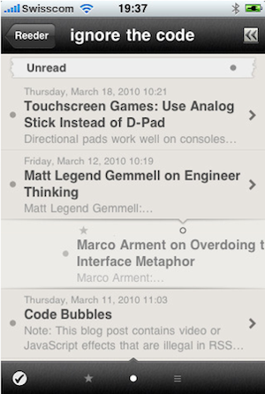 But maybe my favorite feature of Reeder is the Tweetie-like ability to swipe an individual feed item to do something. In Tweetie, when you swipe a tweet, a bunch of options are shown under that tweet. In Reeder, it’s a bit different. Swiping right toggles an item between read and unread status. Swiping left toggles between starred and unstarred status. It’s brilliant. (And yes, there is also a button to mark all as read.)