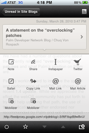 Obviously, clicking on an individual story loads that item (including any images). And in the story-view mode you have a new set of options along the bottom that let you mark an item as unread, star it, or a button to load a range of great Reeder features. For example, on this overlay menu, you can make a Google Reader note about an item, you can share it with your Reader friends, you can save it to Instapaper, you can send it to Twitter, you can open it in Safari, you can mail it to someone, etc. There are a half dozen other features which you can customize in the app.