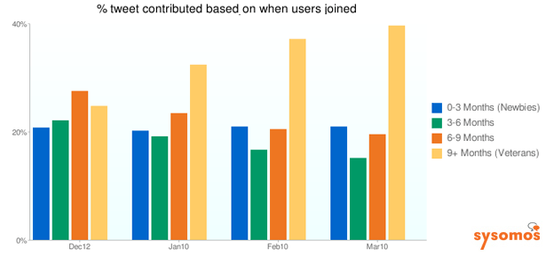 Now I have some data to back up my theory. Social media analytics company Sysomos just released some data based on its analysis of over one billion Tweets which shows the contribution of updates by how long people have been on the service. The most active users are those who joined Twitter more than nine months ago. They account for 41.6 percent of all Tweets.