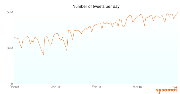 In terms of total Tweets, Sysomos estimates there are now 53 million Tweets a day, which is up 30 percent since December, 2009. Twitter passed the 50-million Tweet mark about a month ago. (You can read more analysis of Sysomos Twitter user data from last year here).