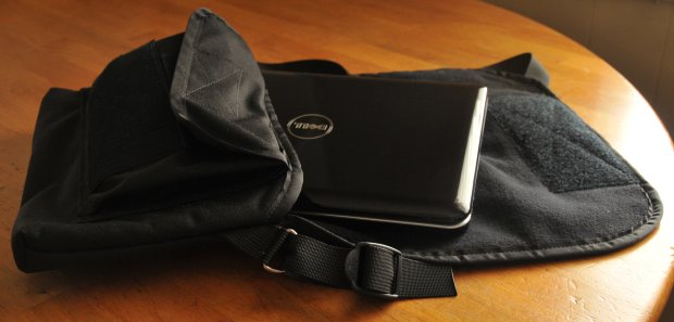 That brings us the product that I have today. Since I needed a case for my Dell Mini 10v with a 6-cell battery, the case that I ordered is customized to that particular design. The stitching is extremely well done, and it obvious even by holding the bag that it’s quality. All of the Psyopper products are custom made, of top-shelf materials. This means the shell is 1000 Denier coated cordura nylon, the lining is high quality polar fleece, the straps are Milspec webbing, and the velcro could probably hold a car door shut. You can also order Psyopper’s products with a PALS grid (which is currently used by the military). Now, it’s important to note that my particular bag is customized to fix the Mini 10v, with the extended life battery. As such, it will only work with this particular netbook, however if your order your bag to fix a standard 9 or 10 inch system it should fit with no problem. In fact, Brad tells me that his sleeves have be used successfully with Acer and Asus products, with no problem. And speaking of that customized fit, the bag holds my netbook very securely. I carry my netbook with me quite often, and at no point have I ever felt that it might be in danger of falling out of the bag, or not properly protected.