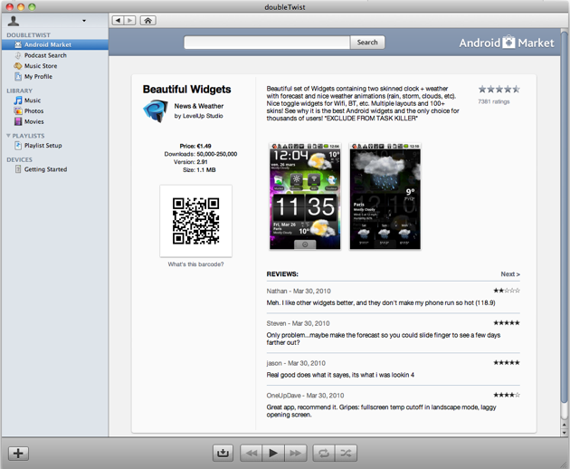 However, doubleTwist’s Market integration comes with a couple of issues. First, it doesn’t include any application categories, like ‘Games’ or ‘Communication’ (though this seems like it would be a fairly minor addition). The other issue is more problematic: you can’t actually use doubleTwist to download and sync applications to your Android device. Instead, each entry on the Market features a QR code that you have to scan from your phone to bring up the appropriate item in Android Market.