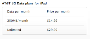 Apple is also giving AT&T a nice little present in the form of the iPad. While the version hitting stores this Saturday will not have 3G connectivity, the one coming at the end of April will. And yes, it will be exclusively provided by AT&T. There was some speculation leading up to the iPad launch that it may launch with Verizon connectivity, but the chances of Apple building a second CDMA version of the iPad anytime soon seem pretty slim at this point. Especially with AT&T giving them an unheard deal for customers: $15 for 250MB-a-month of data usage and $30 for unlimited data. As anyone with a 3G card will tell you, this is basically half-off of the normal data rates the carriers charge.