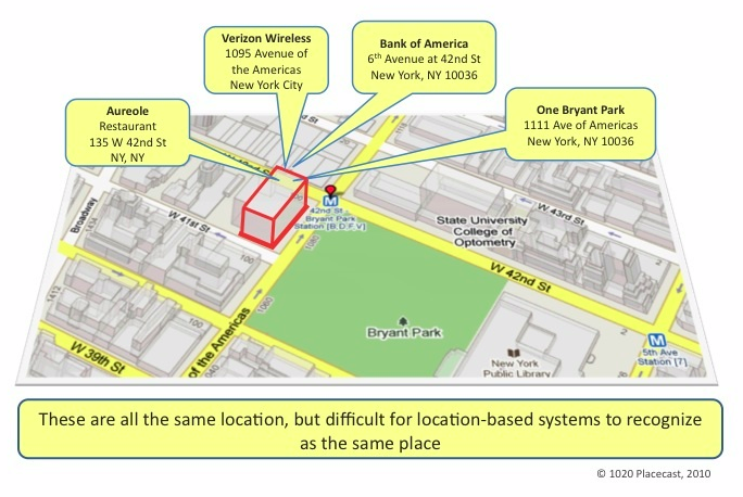 The Placecast Match API aims to resolves two issues with large location-based data sets. First, it disambiguates addresses, indentifying all of the different ways to express the address of a location. Second, it maps all the relevant IDs from different content providers to that same place on the planet, so that it is always referred to correctly by any other system. Placecast’s system has already been in place for more than a year and has already processed millions of location records worldwide.
