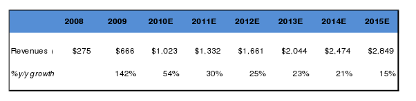 SharesPost’s report estimates that Facebook is currently burning through $200 – $300M of cash a year for its operational expenses and for capacity expansion, and is cash-flow positive, which we knew. The report highlights Facebook’s 400 million users and its dominance as the world’s largest social network, wide network of developers building off the platform, and the amount of ecommerce and advertising revenue flowing through the network. For example, Zynga spends between $5 million and $8 million per month on advertising on Facebook. The report estimates that Facebook’s revenue for 2010 will hit $1 billion and nearly $3 billion by 2015, another stat that we’ve heard before.