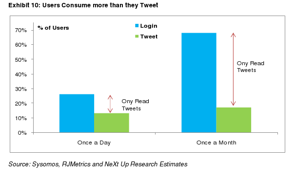 And the report confirms that most Twitter users are passive readers rather than active posters. As I’ve long suspected, people on Twitter tend to consume more than they Tweet. About 68 percent of users login at least once a month, but only 17 percent Tweet. (Although, they do tend to start Tweeting more once they’ve been on the service for 9 months or longer).
