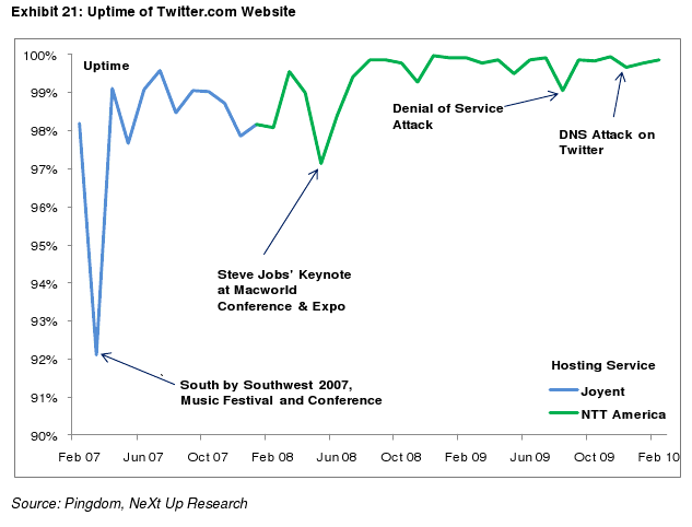 Another nice chart in the report show how Twitter’s uptime has improved since its early days (other than when it is under a denial of service attack),