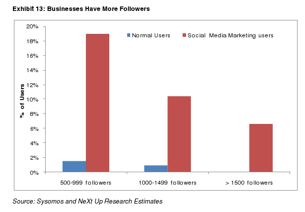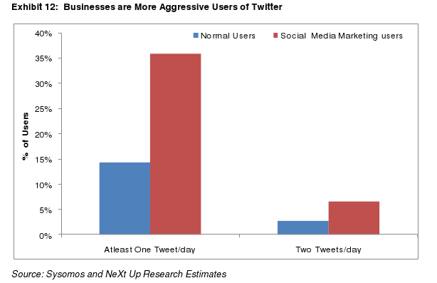 The best bet for Twitter to make money, says the report, is to continue to become a marketing channel for businesses and start charging for leads. The opt-in model of people following businesses and brands should result in much higher sales per lead than other marketing channels such as email marketing, telemarketing, or bulk SMS marketing. Businesses who use Twitter for social media marketing purposes tend to have many more followers than normal users and also Tweet more often.