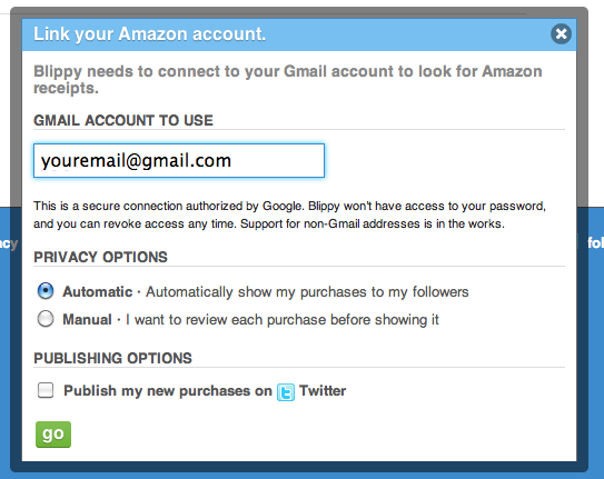 The new Amazon integration requires users to grant Blippy access to their Gmail accounts via OAuth (this only works with Gmail, though the site says it plans to support other email services soon). After linking your Gmail to Blippy, the service will automatically scan your account for Amazon receipts, which it will use to display the items you’ve purchased in your Blippy feed. When I asked Blippy co-founder Philip Kaplan if they had Amazon’s approval, he said they didn’t ask for it, and they weren’t sure they needed it, either.
