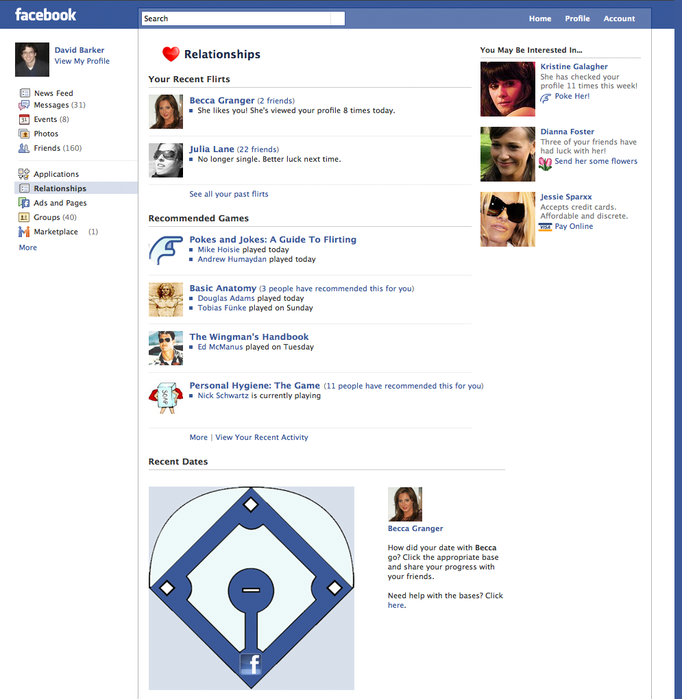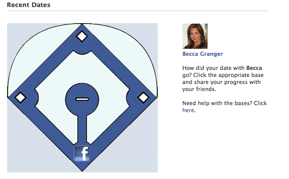 Finally, there’s a ‘Recent Dates’ section. It’s unclear exactly what this is for, but there’s a Facebook-branded baseball diamond that apparently prompts users to share “how far” they got on their recent dates to their friends’ News Feeds. Given how much these definitions have shifted over the years, this could get messy.
