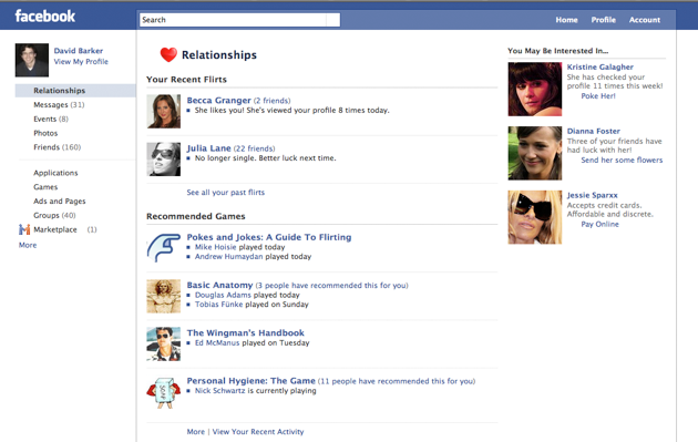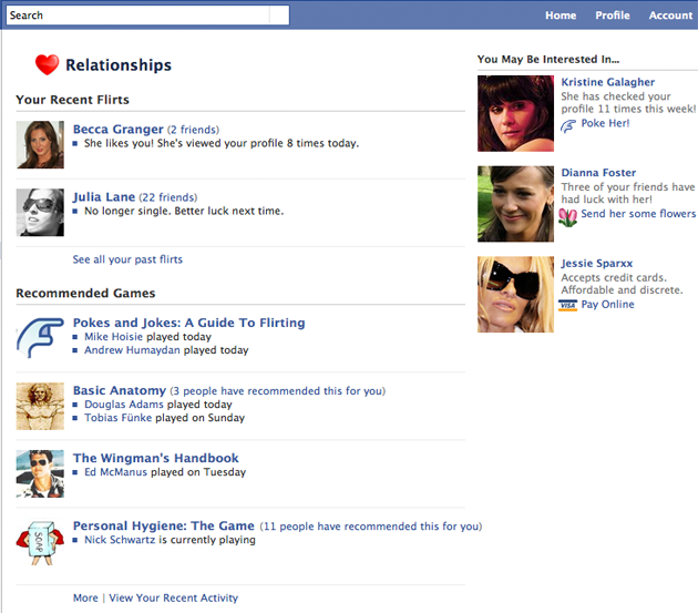 The site appears to be broken up into three sections: at the top is a section for ‘Flirts’, which displays the Facebook friends you’ve been interacting with most. In a move certain to cause riots, Facebook is now allowing users to keep tabs on how many times each of their friends has visited their profile. Facebook claims that this will make it easier to figure out who is lusting after you, and that “shadier” visitors will simply learn not to be so creepy. Below this is a section for games and lessons. These appear to be the Zynga-designed apps, which cover everything from flirting to lessons on hygiene.