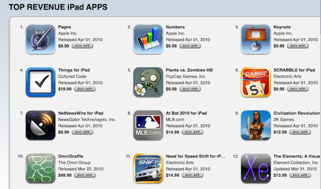 Apple also has it’s regular app lists ready for the iPad. For example, here’s a list of the top iPad apps in terms of revenue. You’ll notice that the top three are all Apple apps.