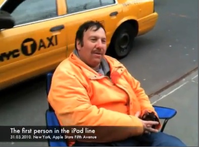 Anyway, this guy is determined to sit in front of the Apple store for two days and nights. The video below was sent to us by Zoltan Kaprinay, a Hungarian tourist who came to New York to pick up his own iPad on Saturday. He was scoping out the Apple store and captured the footage below.