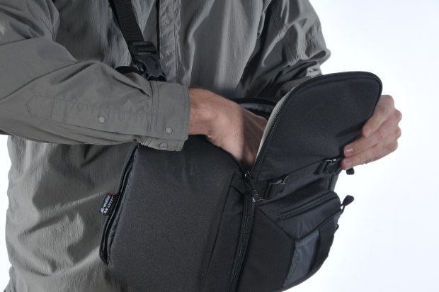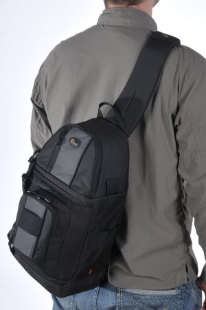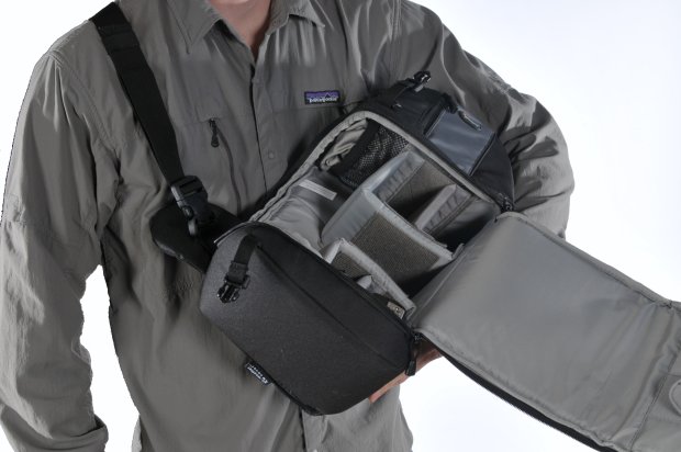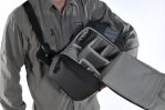 So there’s a problem with camera bags. They can be really comfortable to carry, but getting your gear out is a hassle (backpack). Or you have a bag that’s not as comfortable to carry, but you can get at stuff fast (messenger bag). The SlingShot line combines the best of both into one bag. You wear the SlingShot over your torso like a messenger bag, but it sits on your back like a pack, rather then on your hip. This makes the pack really comfortable to wear, particularly when compared to a messenger bag that can get uncomfortable after extended use.