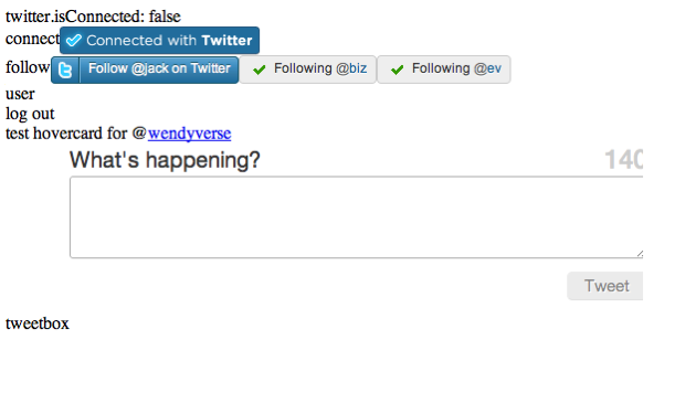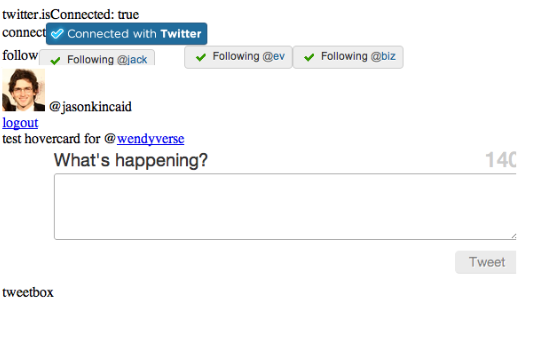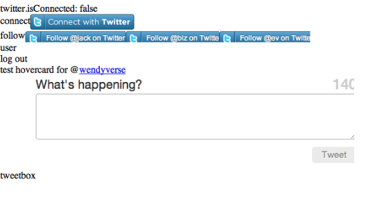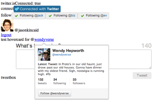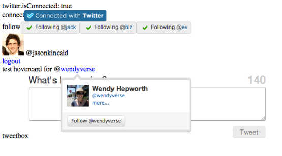 The site, which will almost certainly be pulled down soon after this post is published, is clearly a testing environment for @anywhere, but it’s currently open to the public. Update: Twitter has taken the site down. It features the following (all shown in the screenshots below): various variable states; a button to ‘Connect With Twitter’; buttons to follow twitter users @jack, @biz, and @ev; a test hovercard that allows me to see @wendyverse’s latest tweets and follow counts at a glance, and a test box that lets me tweet. It isn’t particularly easy on the eyes, but it works well enough.