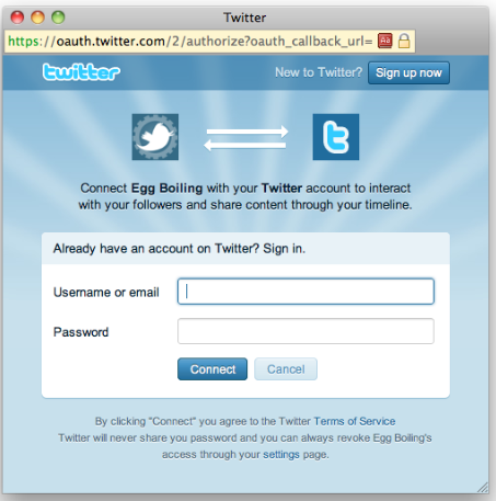 Hitting “Connect to Twitter” pulled in my Twitter profile photo and gave me the option to log out. Clicking on each of the ‘follow’ buttons appropriately changed the status from “Follow @jack” to “Following @jack” the next time I refreshed the page. (it just showed ‘pending’ until I refreshed). And sending a tweet from the tweet box worked properly (it says that my tweet was sent via Egg Boiling).