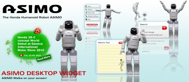 The widget can be installed on Windows XP/Vista or 7 PCs as well as Macs with OS X 10.4 or higher on board. Your desktop Asimo then walks around on the screen, jumps, plays soccer, and performs his famous dance (there’s also a memo pad and Google search to make him a bit more useful).