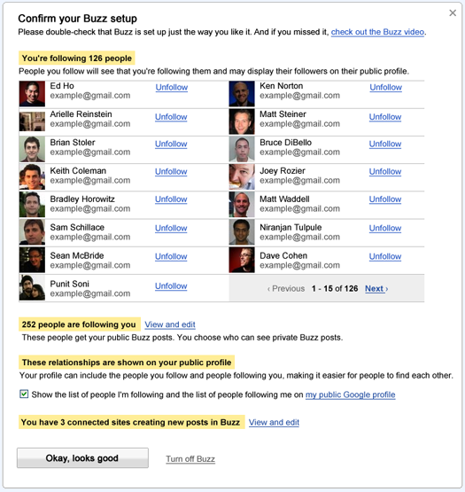 For the tens of millions of you who have already started using Buzz, over the next couple weeks we’ll be showing you a similar version of this new start-up experience to give you a second chance to review and confirm the people you’re following.
