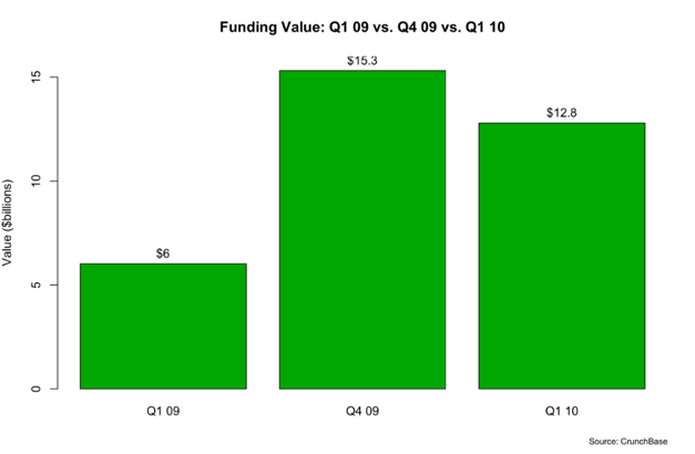 Venture capital is flowing once again to startups at a steady pace. During the first quarter of 2010, the total value of venture funding doubled to $12.8 billion from $6 billion a year before, when it was scraping the bottom of the barrel. However, the funding amount is down 16 percent from the $15.3 billion in the fourth quarter of last year, based on an analysis of CrunchBase data.