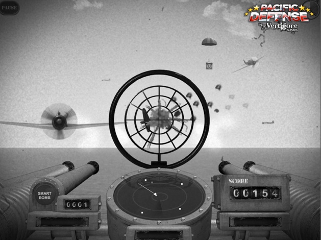 The game is designed so that you hold it up in front of you and look through it like a window into another world. The bigger size of the screen gives it more of a window-like feel than the peephole view you get on the iPhone. The game is in black and white with scratches to make it look like an old newsreel. You tilt the iPad to aim and tap the guns on either side with your thumbs to shoot. But the game really becomes interesting when you turn on the augmented reality control mode in settings. Then instead of just tilting the iPad, you can turn your whole body and spin around to shoot at the planes 360 degrees around you or at the torpedos below. If you play with headphones, there is also 3D sound, so you can hear the planes coming from your left or right or from behind. A swivel chair is really key to augmenting the augmented game play (see video below).