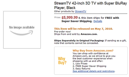 The TV has some interesting features, including a built in Blu-ray player, browsing capabilities, and a 500GB hard drive. Most intriguing though, is that it claims to be able to show 3D content without the need for glasses of any sort. The fact that a Google search for StreamTV turns up nothing makes us very suspicious, but for $5999.99 and $3999.99 (42 and 37-inch, respectively), we would expect nothing less. This mysterious company also has a regular 55-inch LCD TV listed on Amazon for $2,299.99.