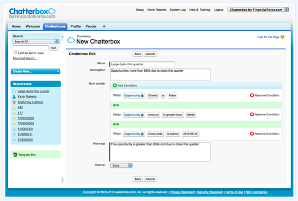 Similar to Facebook, employees can create business profiles with professional information like personal contact data, area of expertise, and work history. Searching other people’s profiles, colleagues can quickly identify individuals who are relevant to their enterprise needs. Users can post status updates to share communications, files and links around a project, sales deal or customer support case. And users can see realtime feeds of personalized updates from people, applications and documents. With Chatter, all status updates from a customer’s Sales Cloud, Service Cloud or custom Force.com application are posted to the feed. So apps actually have the ability to post status updates, similar to a person, creating an actual ecosystem around apps and employees. Any app listed on Salesforce.com’s AppExchange will be able to stream updates to the Chatter feed. Since they are delivered on the Force.com platform, developers can build or enhance cloud applications to use Chatter’s profiles, realtime streams, and APIs.