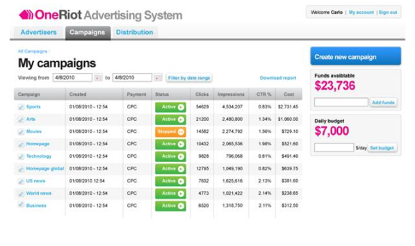 Last year, OneRiot ventured into the advertising world with RiotWise, an ad format which places content in an emphasized position in their realtime feed. The search engine also launched a pilot program of RiotWise Trending Ads, a stream of ads that correspond to trending topics as they emerge across the social web, that has since been integrated into the search engine’s API. And the startup recently launched self-refreshing realtime trending ads. Today, the realtime search company is taking RiotWise self-service, meaning any advertiser can now create campaigns using OneRiot’s ad network.