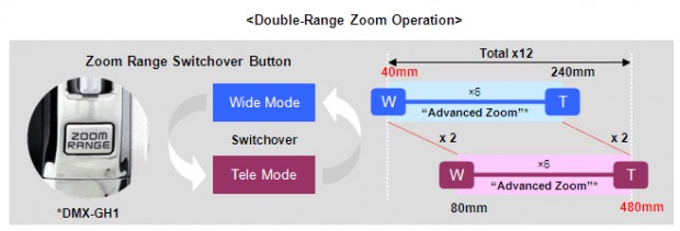 Both also come with Sanyo’s proprietary “Double Range Zoom” function, which allows users to instantly switch between “Wide Mode” (40 mm to 240 mm) and “Tele Mode” (80 mm to 480 mm) with the push of a button (see graphic below).