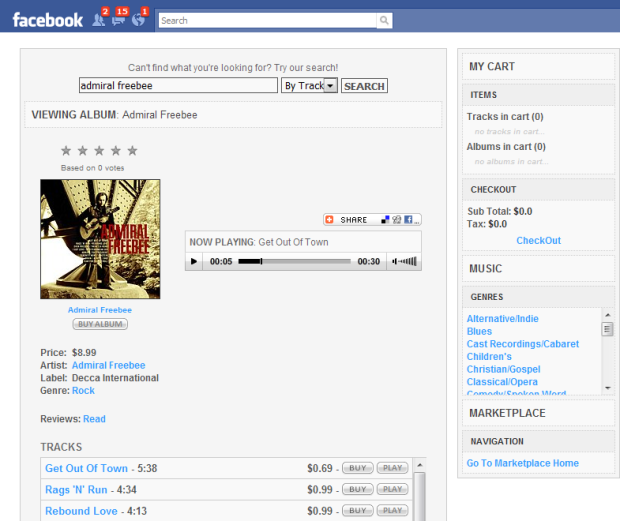 With the Music Store Facebook app, users can discover and purchase millions of songs in high-quality MP3 format thanks to a partnership with MediaNet. It’s far from the only Facebook application to enable users to do that (Lala springs to mind), but notably, you don’t even need to sign up for a WaTunes account to be able to stream 30-second versions of songs or buy and download full tracks and albums.