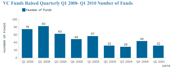 Only 32 funds were able to raise money in the first quarter, down from 44 last quarter and 57 a year ago. Only 5 new funds were launched, with the vast majority of the money going to established funds, including Battery Ventures and Oak Investment Partners. Both raised new $750 million funds.