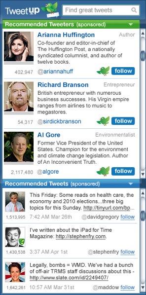 What will matter is how much distribution TweetUp can get in the next few months. Remember, Twitter is only offering its Promoted Tweets on its own site for now, which means that third-party Twitter clients (which many people use exclusively) are left to their own devices to integrate ads themselves. And TweetUp is making a very tempting proposition: it’s giving developers who integrate the service 50% of the ad revenue. Likewise, publishers can integrate a TweetUp widget that uses AdSense-like technology to display sponsored tweets relevant to the content on their site. TweetUp is also paying some developers up front to integrate the service. Its roster of partners already include Seesmic, Twitdroid (a popular Android client), twitterfeed and Answers.com.