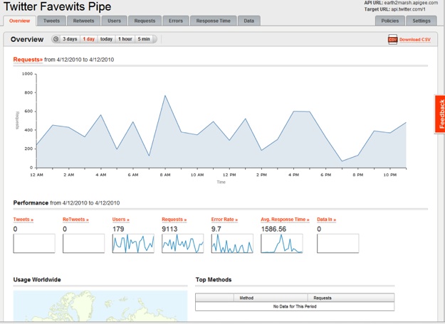 Apigee is a Google Analytics for APIs. For developers who rely on data from other sites and companies, it monitors how much data they are using (message requests), the error rate, response times, and downstream users. For the Twitter API, Apigee added the number of Tweets and retweets going through a developers app, as well as the location of users on a map for geo-coded tweets. For instance a developer with a Twitter iPhone client could use Apigee to monitor how many times an hour his app is making data calls to Twitter.