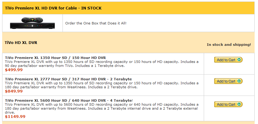Just in case the 1TB drive in the TiVo Premiere isn’t big enough for you, WeaKnees is now selling two upgraded models with a bit more storage capacity. The TiVo authorized reseller has a 2TB and 4TB Premiere available for $849 and $1,149, respectively. That’s a lot of recording storage, boys and girls, and currently the only way to get a larger drive in the Premiere.