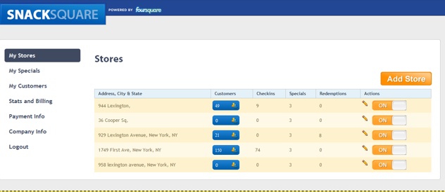 When you go beyond the big cities, there aren’t that many deals. In fact, according to Gillmore, there are only a total of 1,500 business venues (stores, restaurants, bars) running specials right now in all of Foursquare. (Tristan Walker from Foursquare says it is closer to 2,000). But that number will surely grow. Gillmore wants to turn Snacksquare into a way for local merchants to manage their Foursquare venues and contact loyal customers. Businesses can add their Foursquare venues to Snacksquare and create SMS advertising campaigns that target the people who come to their venues.